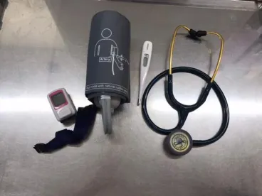 まずはバイタルセットです。体温計、血圧計、パルスオキシメーター、聴診器です。