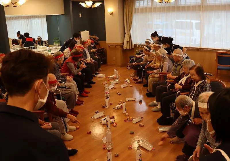 第一競技のペットボトル倒しは、自分のチームの色のペットボトルをすべて倒したタイミングで終了です。