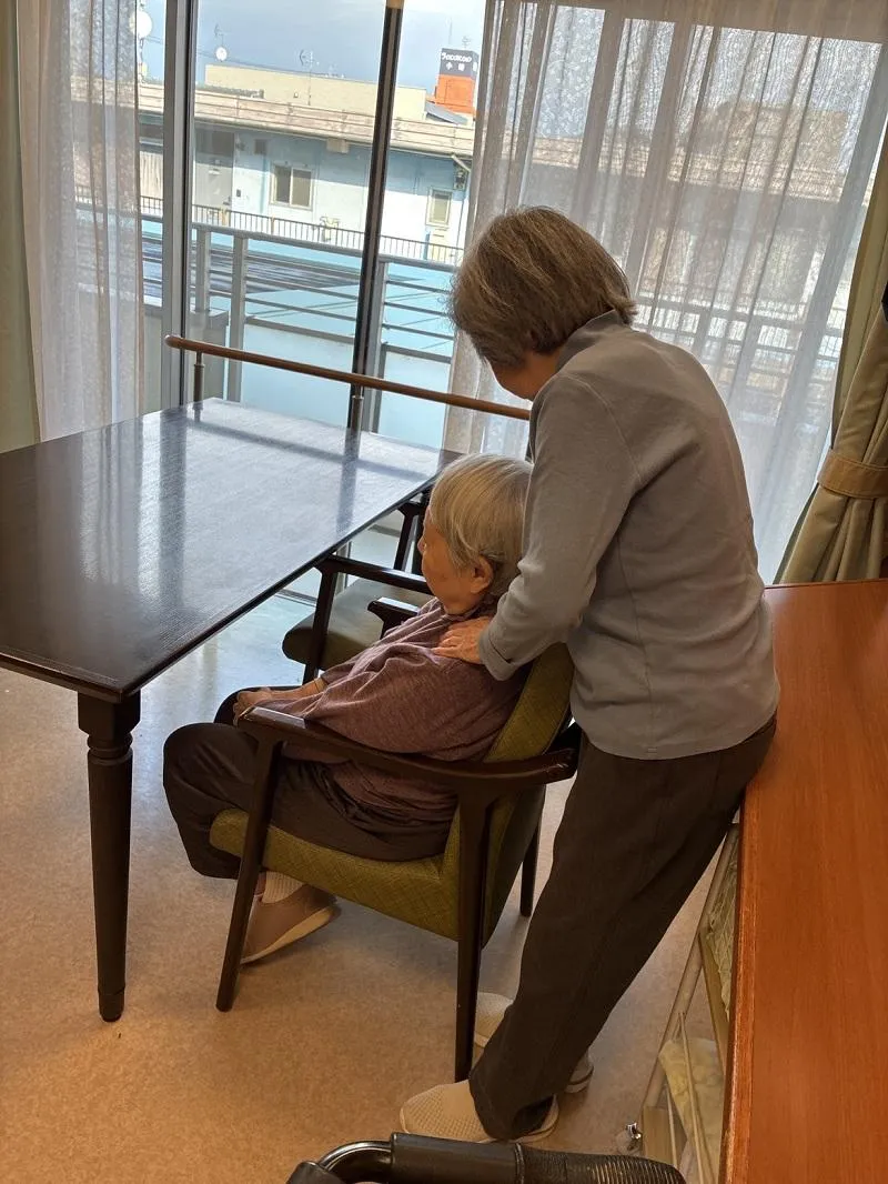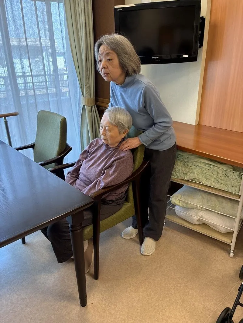 日差しがよく入り、ぽかぽかのここは皆様のお気に入りスポットです。この日も、仲良し二人組で肩もみされていました。「昔々 あるところに はげたおじいさんと 怖い顔のおじいさんが…」と、昔話風のお話しで盛り上がられていました。
