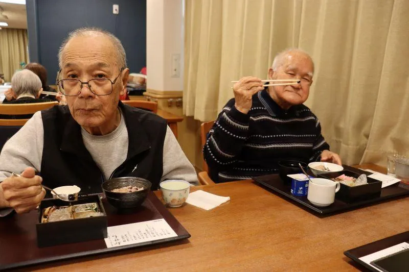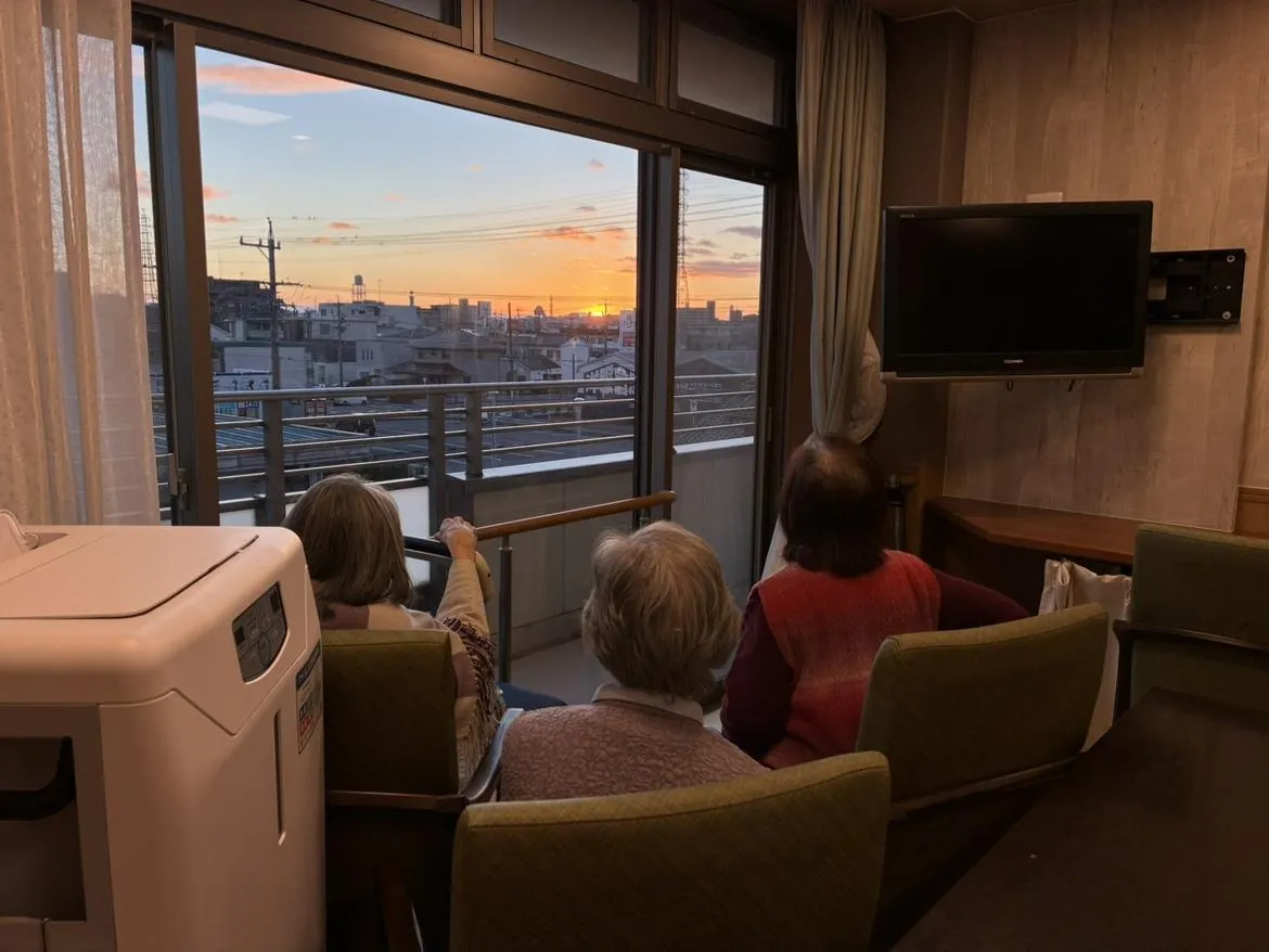 初日の出を見ながら新年を迎えることが出来ました。朝食はお赤飯にお節料理です。普段はなかなか食の進まない方も、美味しそうなお節料理を見て、ご自分でスプーンを持って召し上がっていました。皆さん、きれいねー、美味しいわーと大好評でした。