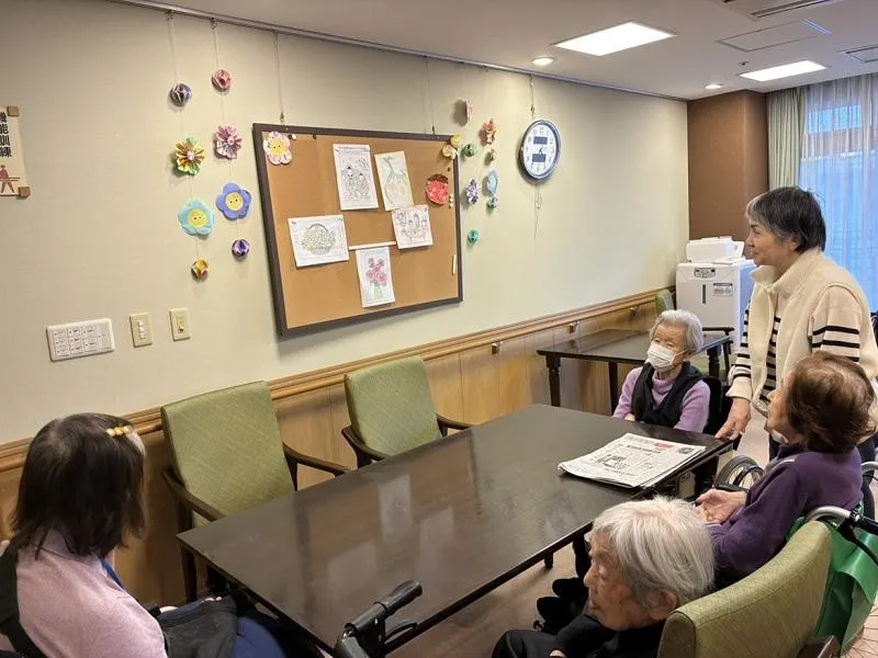 フロアの壁が少し寂しかったので、お客様と装飾を作りました。これからの春に向けて、お花の形のモチーフを作っていただきました。出来上がった作品をスタッフが壁に飾り付けていくと、壁がとってもにぎやかになり、お客様からも歓声が上がりました。
