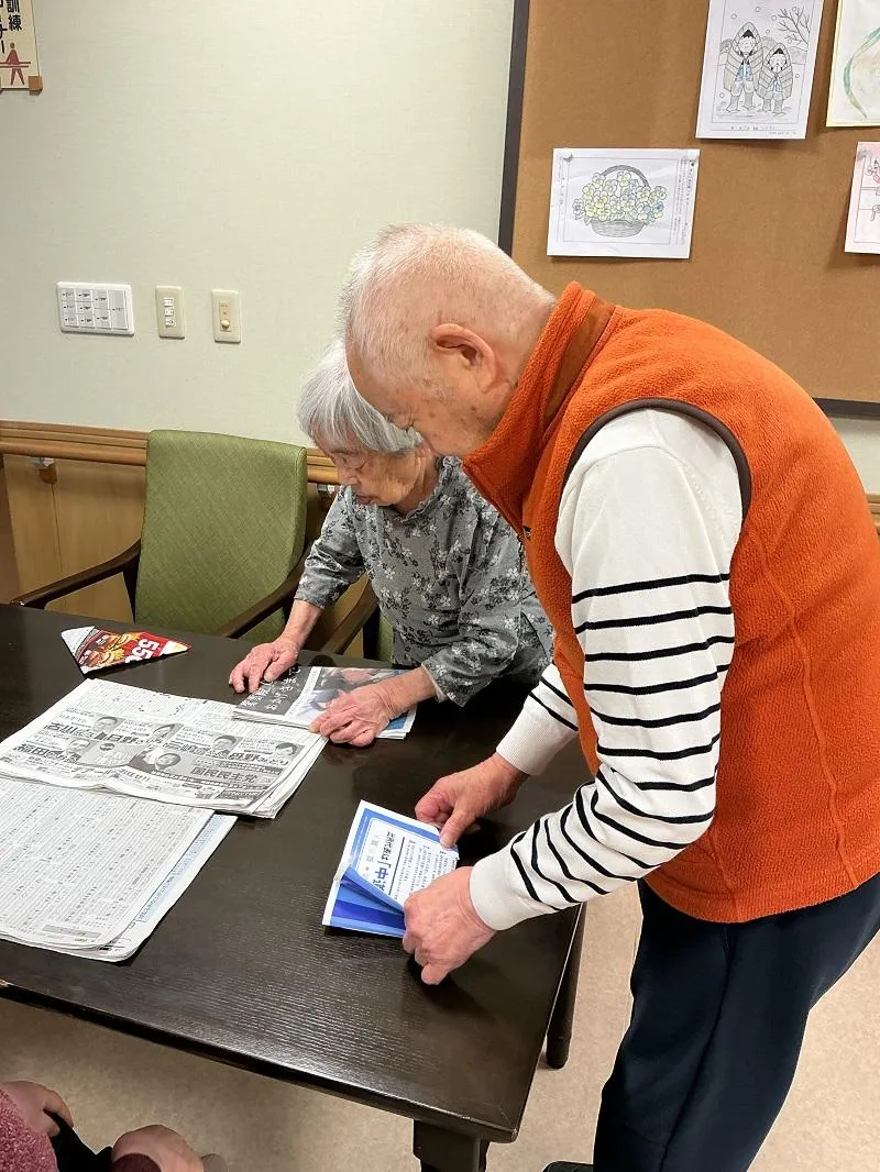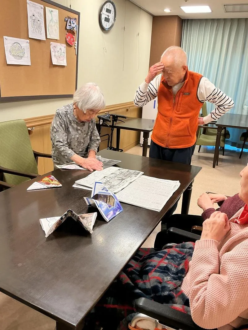 新聞のチラシを見ていたお客様。昔を思い出されたようで、紙飛行機を折ってくださいました。そして、他のお客様にも折り方を伝授。急遽【折紙教室】の開催となりました!「ここはね、こうやって折って…」とていねいに折り方を皆様に教えて下さり、何機か紙飛行機が出来上がりました。