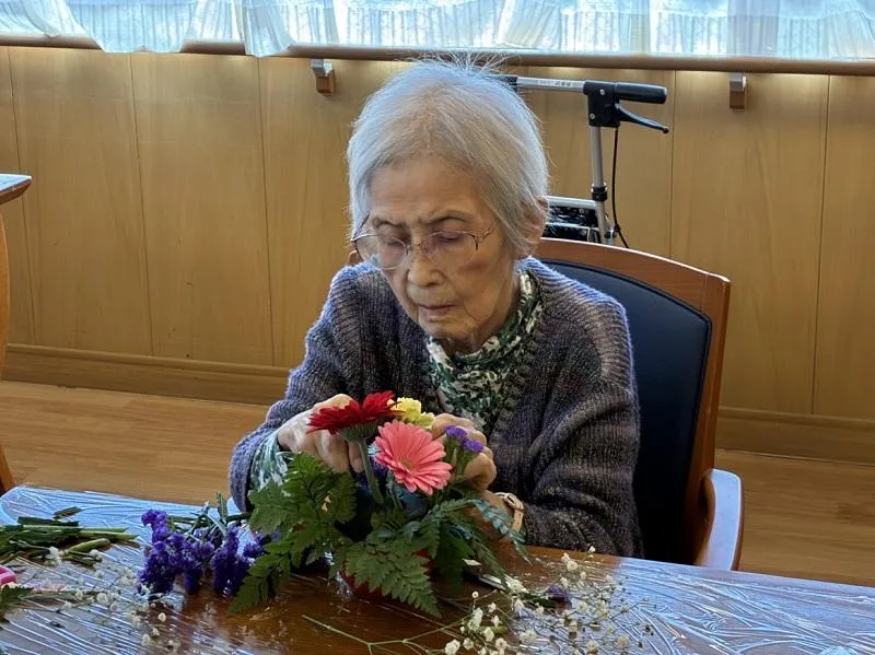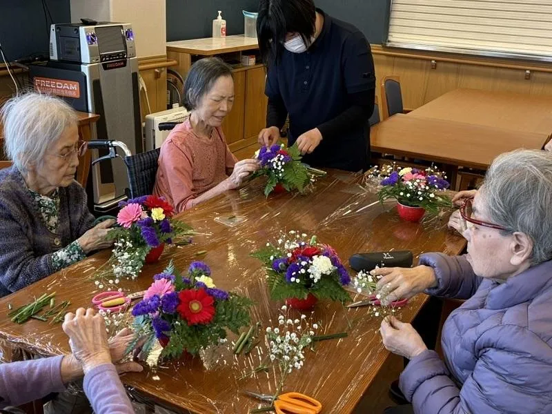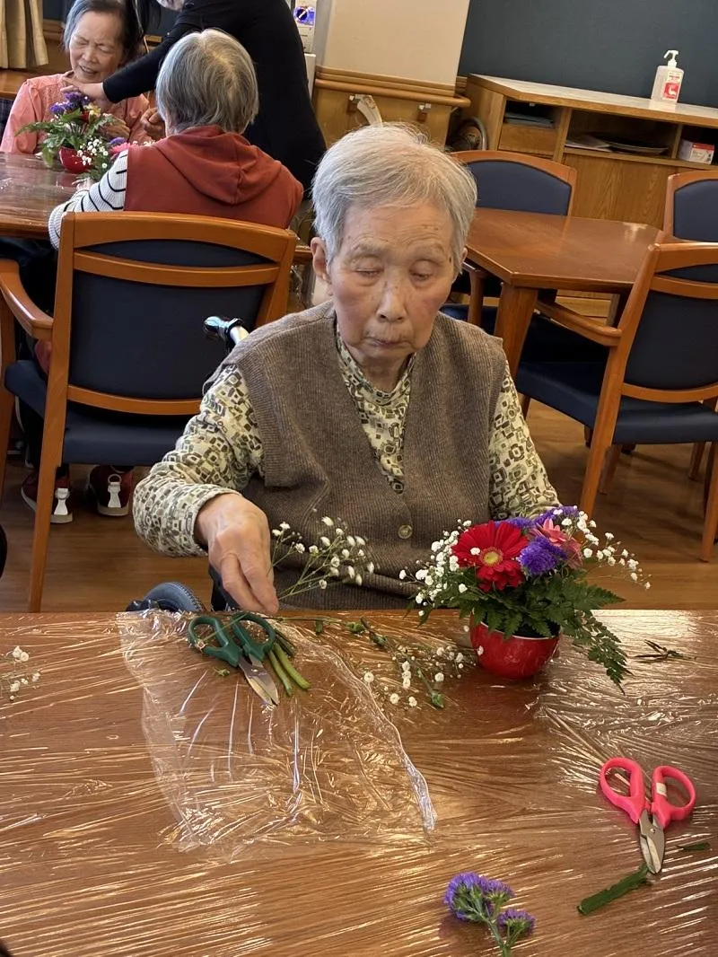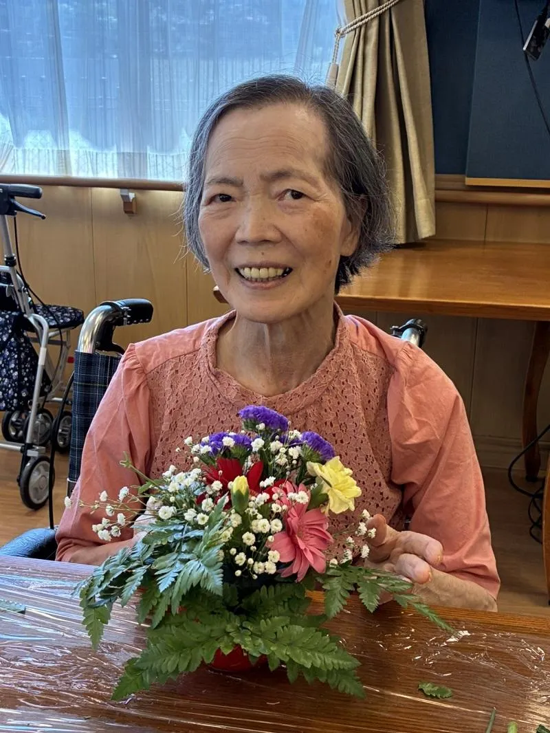 ひさしぶりにフラワーアレンジメントを開催しました。“どこから見ても正面”が難しいようで、「昔は華道も習っていたけれど、これはまた違うのね」と仰りながら、茎の長さを慎重に切ってオアシスに刺していらっしゃいました。出来上がりは「綺麗だね~」「同じ花だけど、あなたの方が上手にできてる!よそのがよく見えちゃう」「お部屋に飾ったら部屋が明るくなるね!」と、話しにも花が咲いていました。
