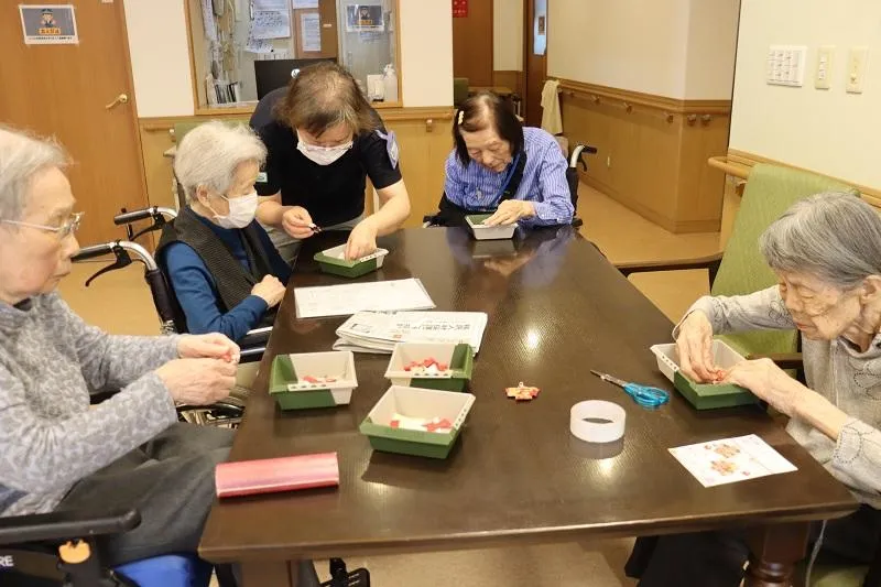 和のミニ着物キーホルダー作りにチャレンジです。針や糸は使わず貼るだけで簡単に作れるはずだったのですが、思った以上に細かく、悪戦苦闘しました。ですが、出来上がりはとても可愛く、「どこに付けようかしら」と喜ばれていました。