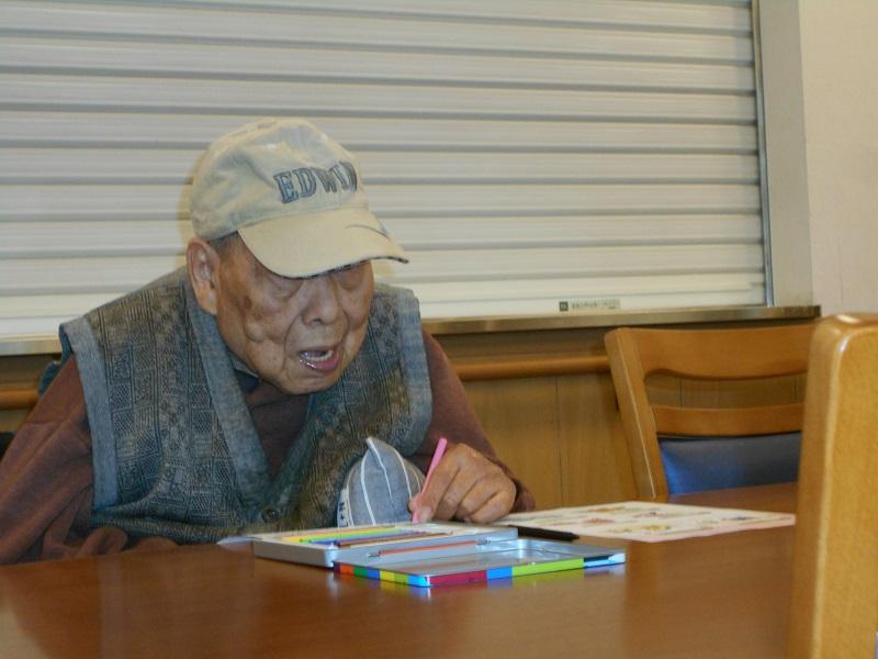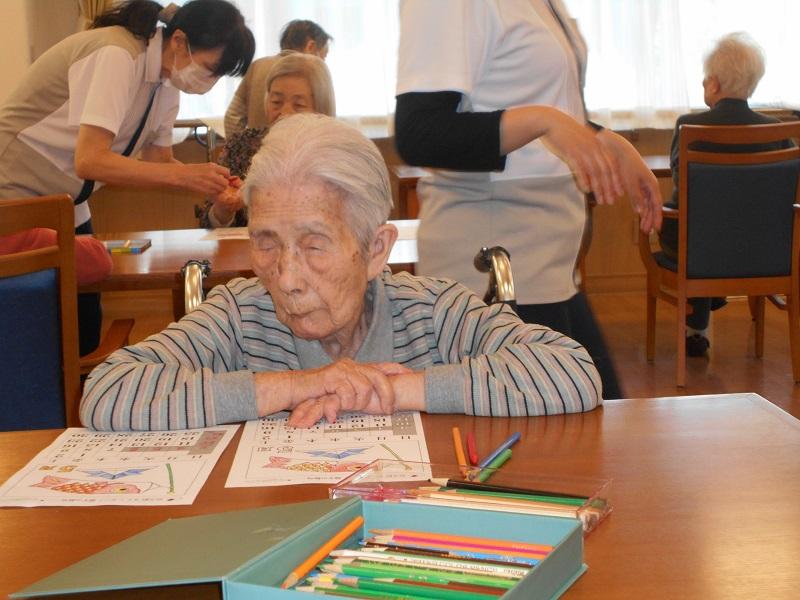 室内レクリエーションでも、5月のカレンダー作りを行いましたが、こちらでは、塗り絵で作成しました。