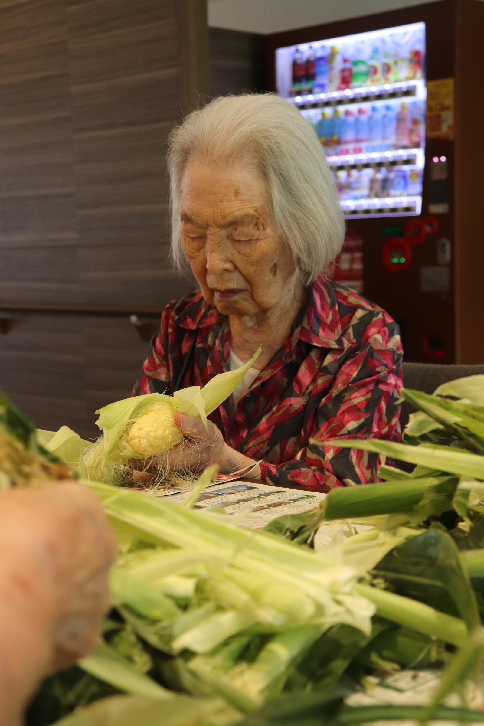 施設中お醤油の香ばしい香りが立込めて準備を始めると次々にモロコシを楽しみにされていたお客様が集まり自然のおいしさを味わっていました。