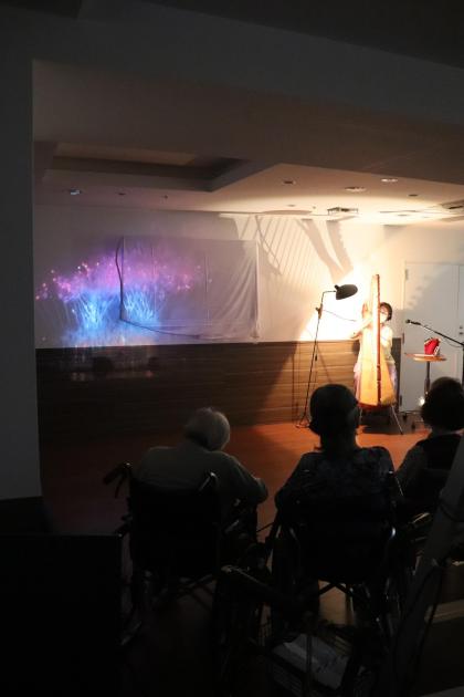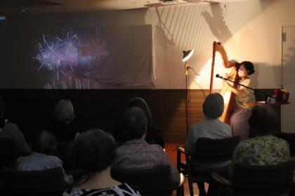 プロジェクターに映し出された迫力ある花火の映像と、ボランティアのハープ奏者の演奏をコラボレーション演出しました。