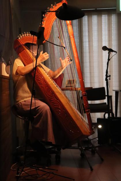 会場を暗くして、ハープの心地よいメロディーでリラックス空間がうまれました。