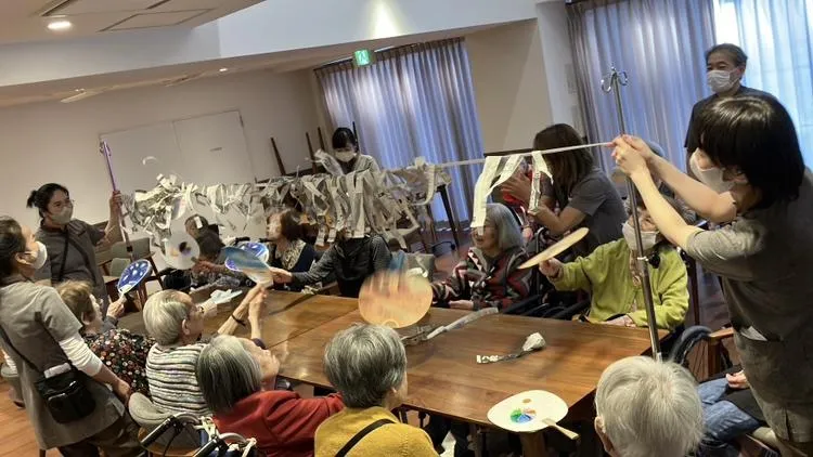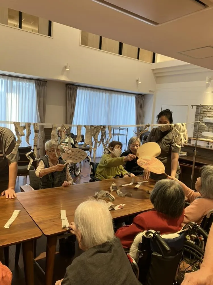 毎日実施している余暇レク会。今日はゆらゆらゲームをみんなで行いました。紐にぶら下がった新聞紙をうちわで風を送り、吹き飛ばすというシンプルなゲーム!シンプルですが、盛り上がり、室内温度が何度か上がっているようでした。