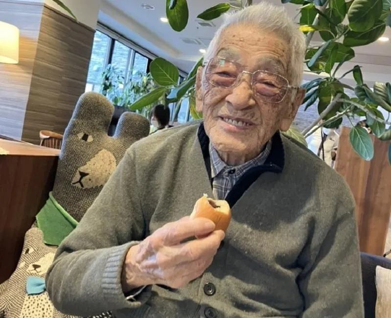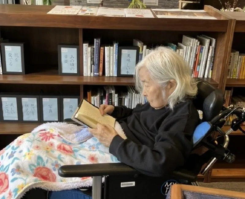 ロビーに入るとまず、当施設最高齢106歳のお客様が、お気に入りのソファでおやつタイムを楽しまれていました。