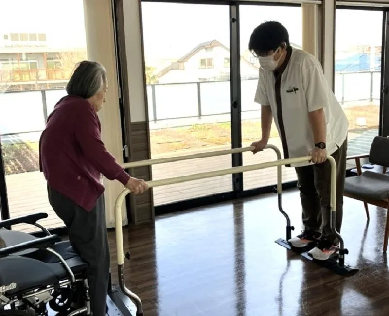 突き当たりのレクリエーションスペースでは個別機能訓練の真っ最中でした。
