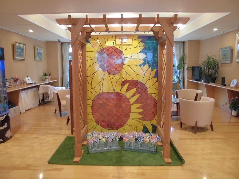 エントランスに大きなひまわりの絵を飾りました。入居者様に描いてもらったプレート180枚で出来ています。近くにお越しの際は、ぜひ見にお立ち寄りください。