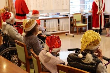 スタッフはサンタさんやトナカイ、雪だるまの着ぐるみを着て、お客様は三角帽子を被って、クリスマス気分!