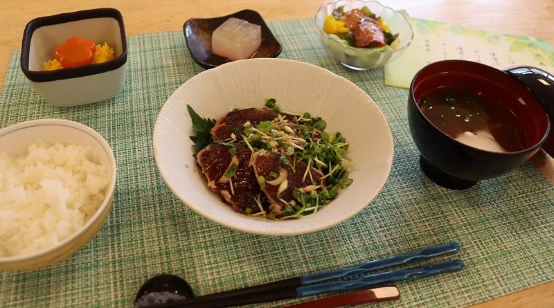 鰹のたたきをメインに、海老しんじょうあん、ローストビーフサラダ、ご飯に味噌汁、水菓子と涼やかなメニューでした。