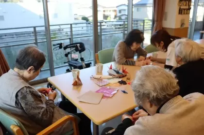 今回も、一人のお客様のお声がけにより談話室で皆で鶴を折ってくださっています。
