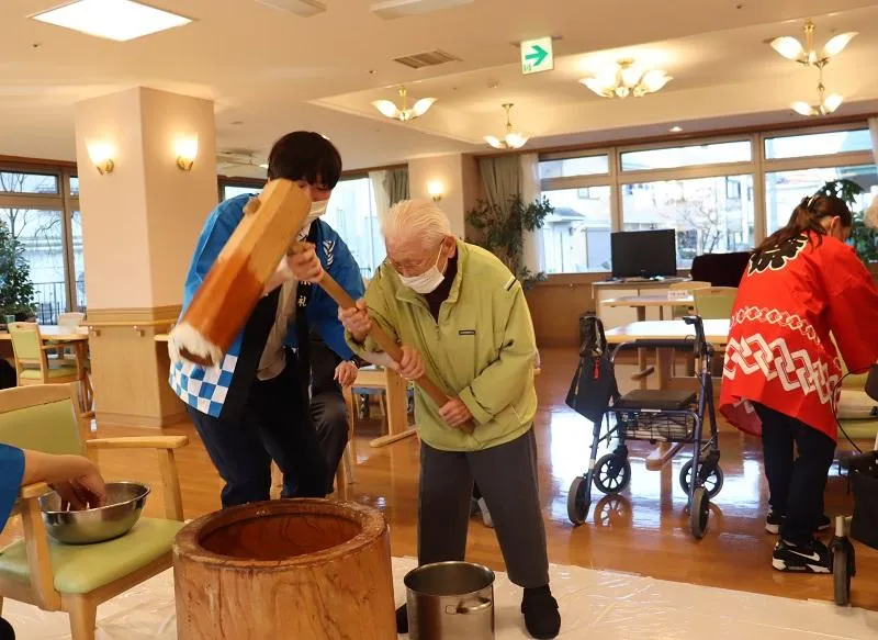 昨年暮れにお客様と一緒に餅つきを行い、玄関に飾る鏡餅を作りました。