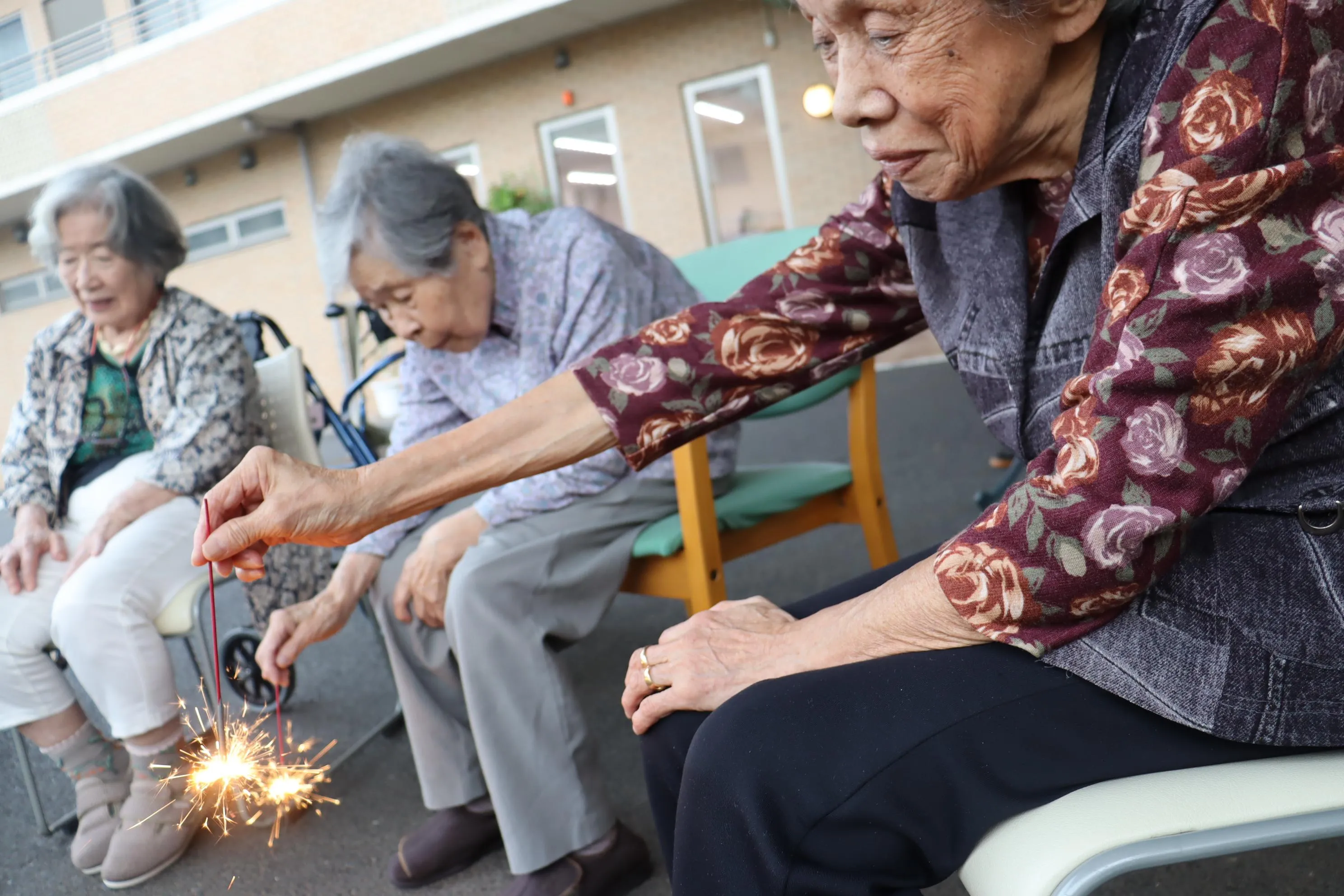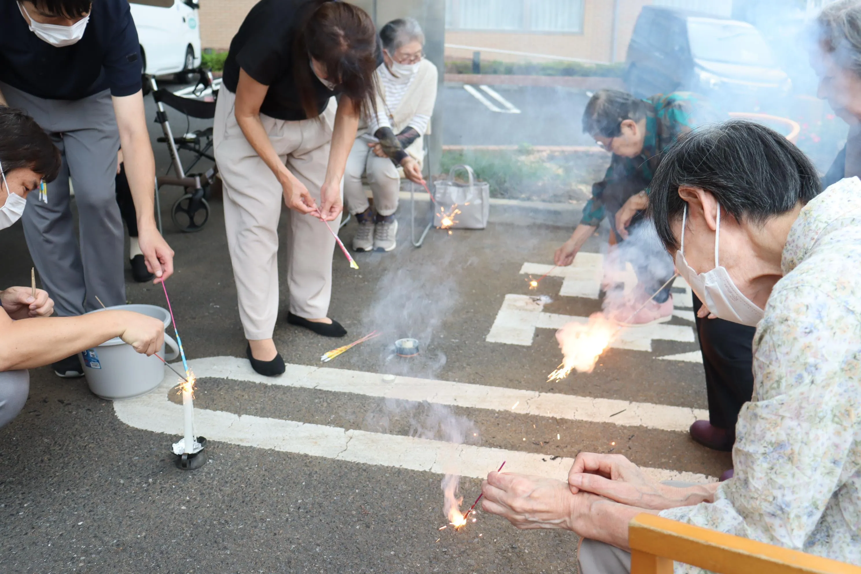 今年の夏も日照りが強く猛暑だったため、秋口の過ごしやすい季節に夏の終わりを楽しむべく、手持ち花火を行いました。時折「昔に子供とよくやっていたわ」と、懐かしむ声もありました。