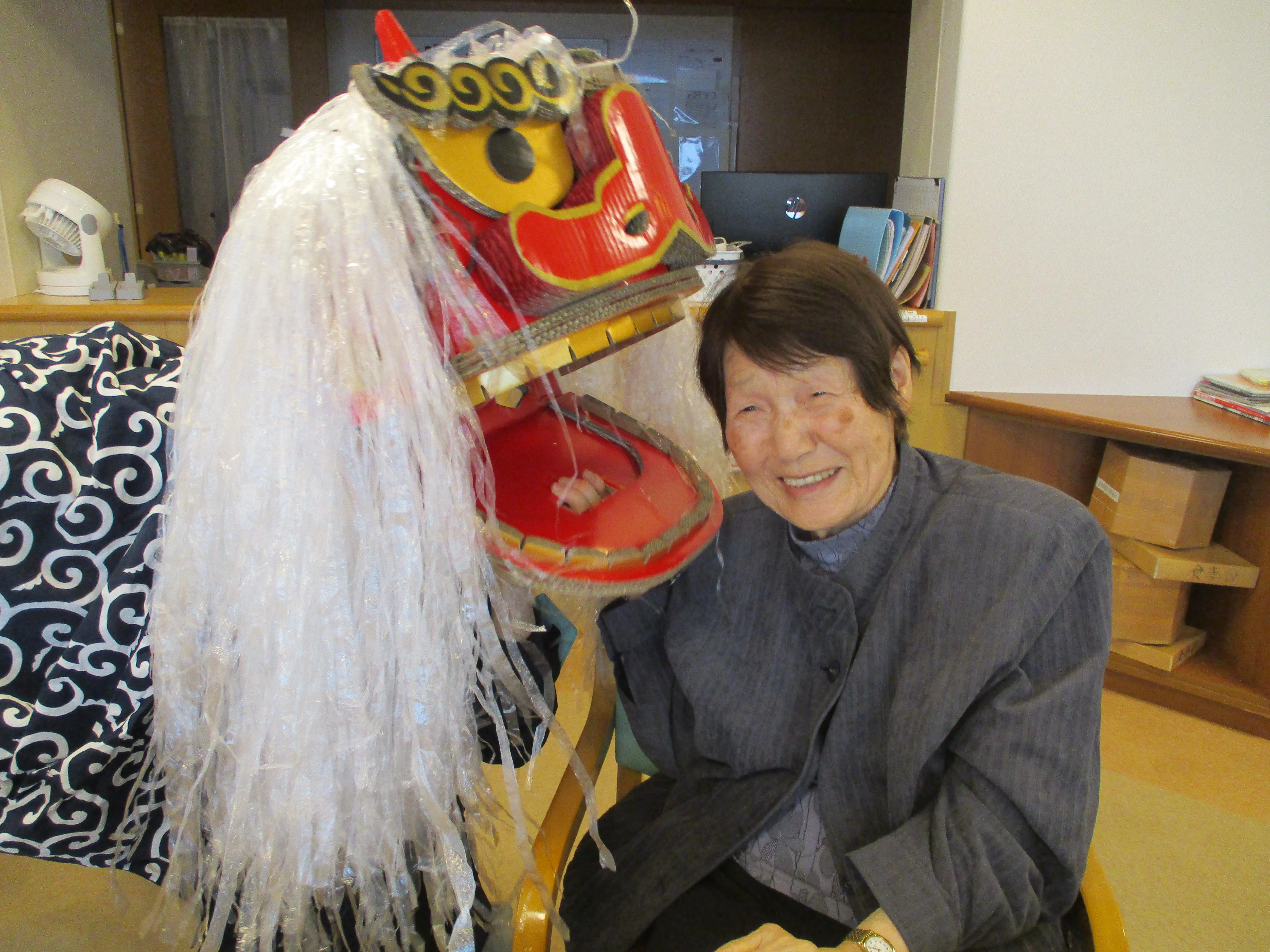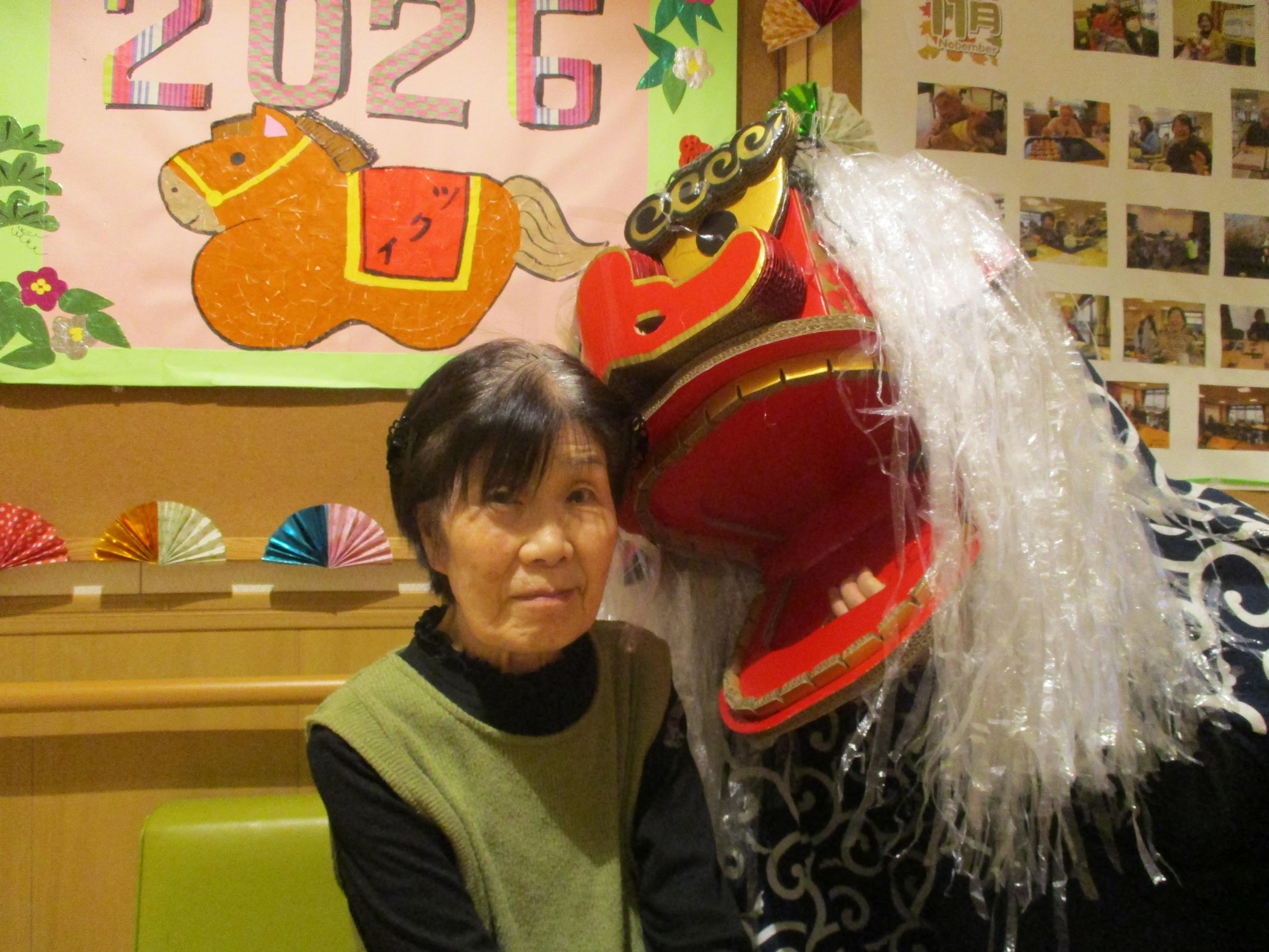新年のイベントで獅子舞が来てくれました。皆様の厄払い、そして良い年になるように願いを込めて、噛ませていただきました。