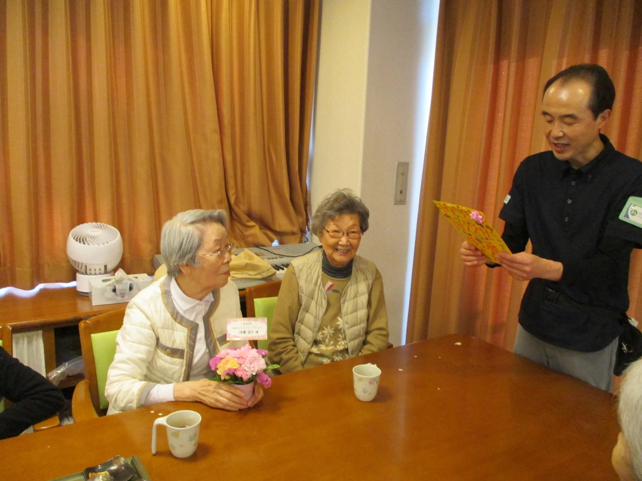 1月に4階のお客様は、4名の方がお誕生日を迎えられました!スタッフからのお花と、手作りメッセージカードのプレゼント。皆様からのバースデーソングで、ささやかなお祝いをしました。皆さん、これからも元気でいてくださいね!