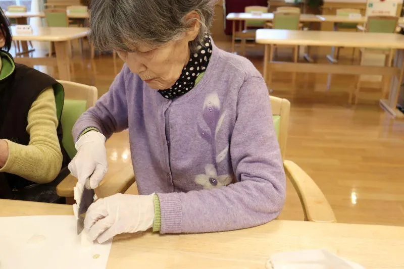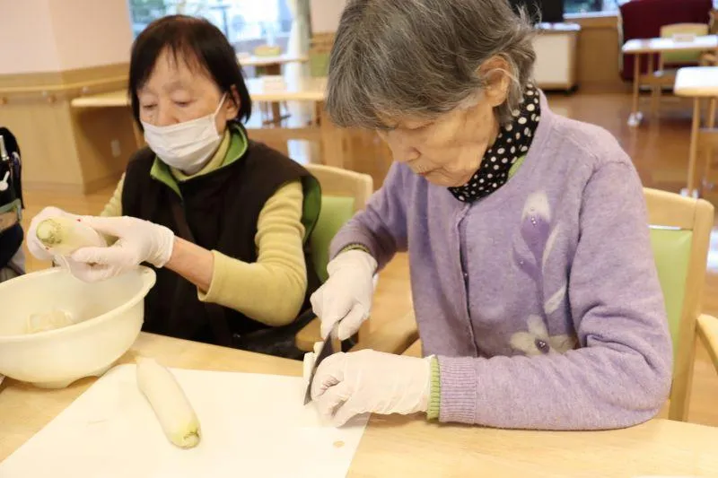 施設で育てた大根を使い、浅漬け作りをしました。包丁を手に真剣な表情で丁寧に切られる姿が印象的で昔を思い出しながら「懐かしいね」と笑顔で楽しまれていました。暫らく、漬けた後、皆様で美味しくいただき心あたたまるひとときとなりました。