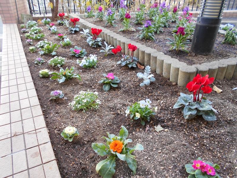 正面玄関の花壇の植え替えをしました。