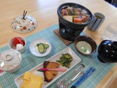 メニューは、すき焼き、ブリの照り焼き、分葱ぬた、卵焼き、茶碗蒸し、胡瓜のぬか漬け、ご飯、味噌汁。デザートに苺を召し上がっていただきました