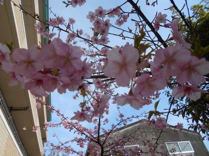 施設内に植えてある河津桜が、愛らしいピンク色の花を咲かせています。