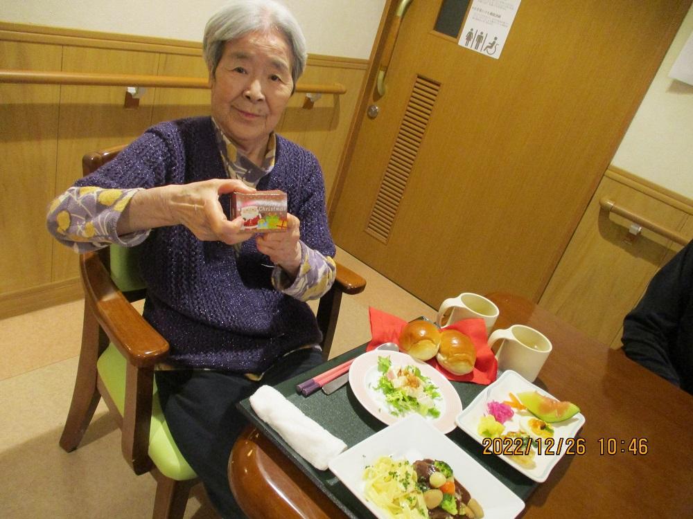 12月26日の昼食にて、クリスマスメニューが提供されました。色とりどりの美味しい献立に、大変喜んでいただけました。
