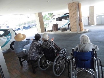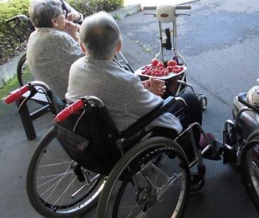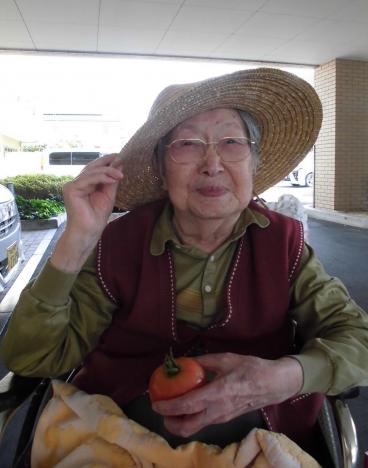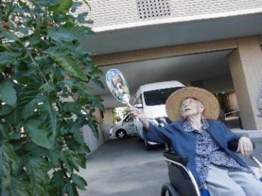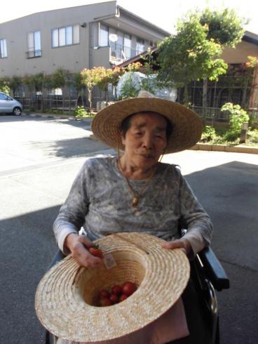 握手をされてるお写真は、収穫したミニトマトを厨房職員へ渡してくださっているところです。