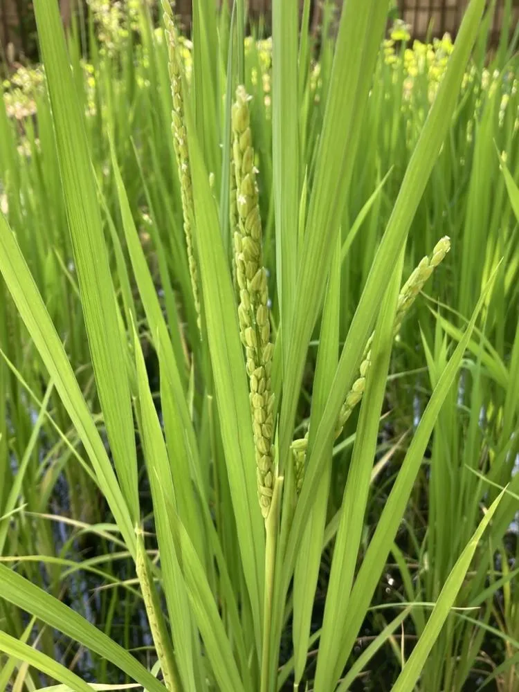 田植えをしてから2カ月ほどたちました。気になるイネは・・・なんと、花が咲きました。白い小さい花が咲いています。少しずつ、お米の形になってきました。