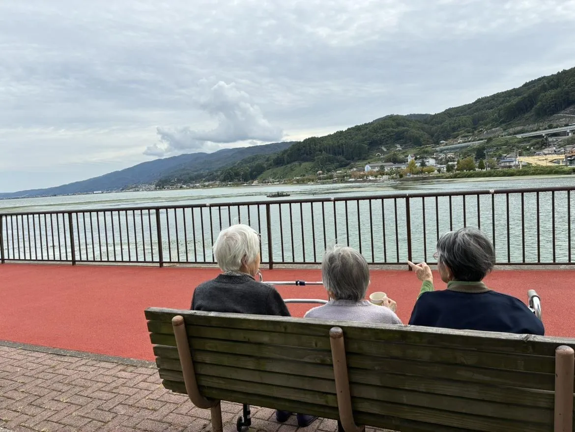 諏訪湖畔のベンチに座り、湖を眺めながらゆったりとした体操を行いました。腕を伸ばしたり、肩を回したりと、無理のない動きで体をほぐし、自然の風を感じながら心身ともにリフレッシュする時間となりました。