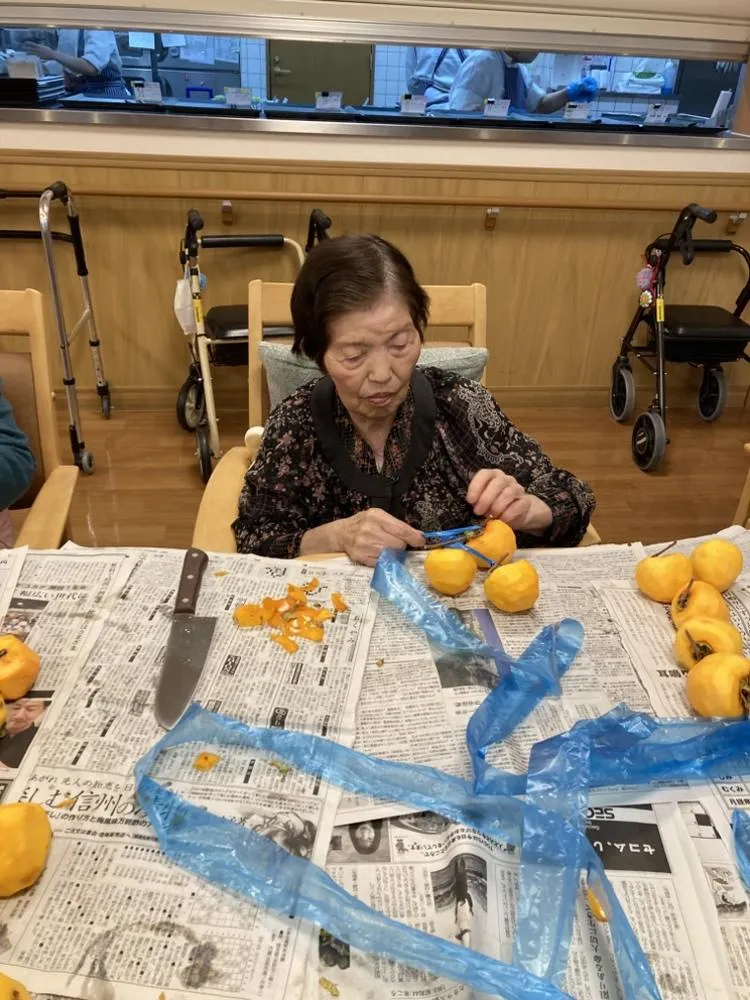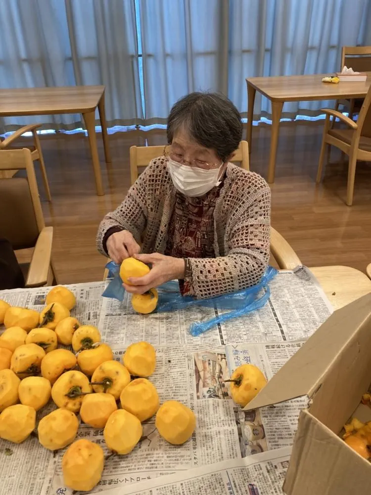 お客様からいただいた柿で干し柿作りをしていたのですが、食べ頃になりました。季節を感じながら召し上がっていただきました。「甘くておいしいね」と、ご好評いただきました!