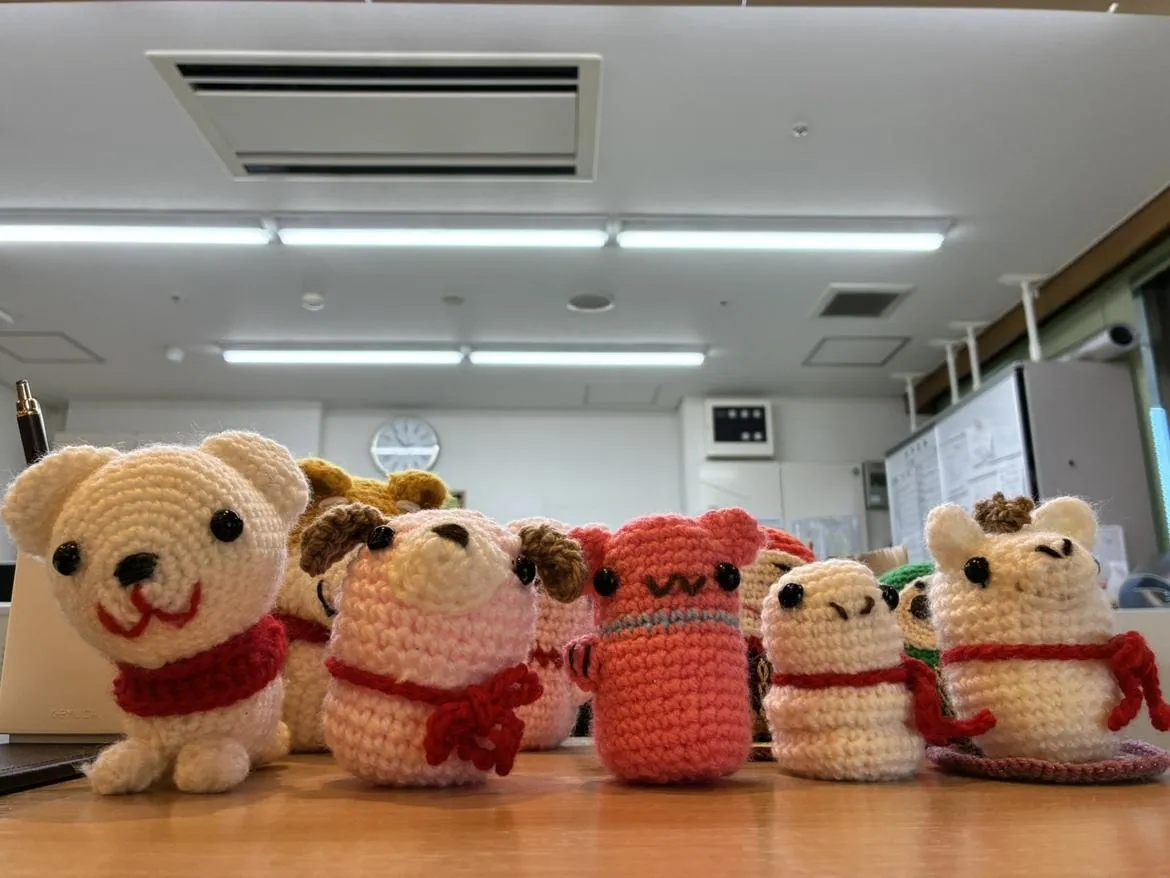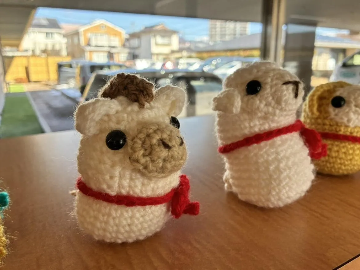 お客様が作成しました編みぐるみです。玄関先と受付にて、皆様のお越しをお待ちしております。