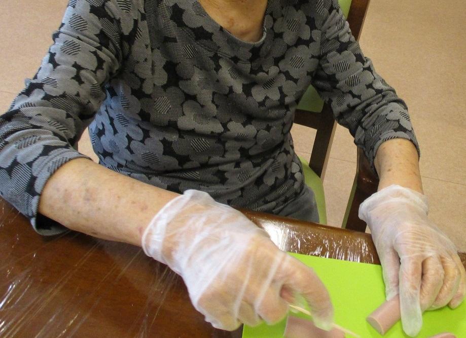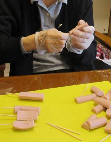 ソーセージにくしを刺していきます。半分に切ったソーセージなので細くてまっすぐ最後まで通すのが大変でしたね。