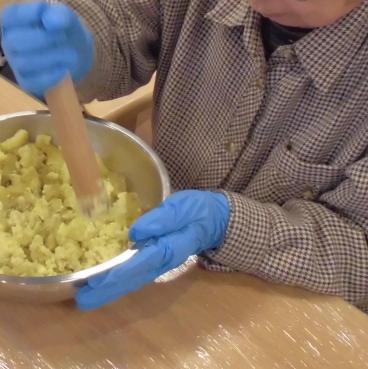 サツマイモを細かく細かくつぶしていきます。なかなかこれが大変!「疲れてきちゃったよ…。もう焼き芋にしようか…。なんてね!あはははは!」とお話しされるお客様も。