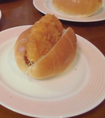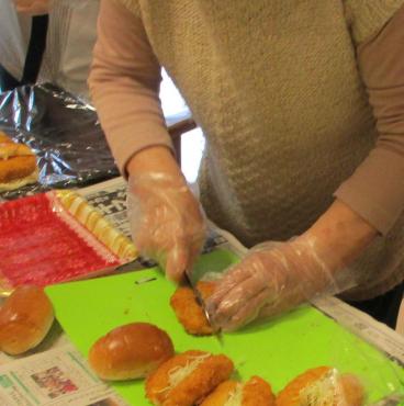キャベツは千切りにし、パンにソースをぬって、コロッケをはさみます。