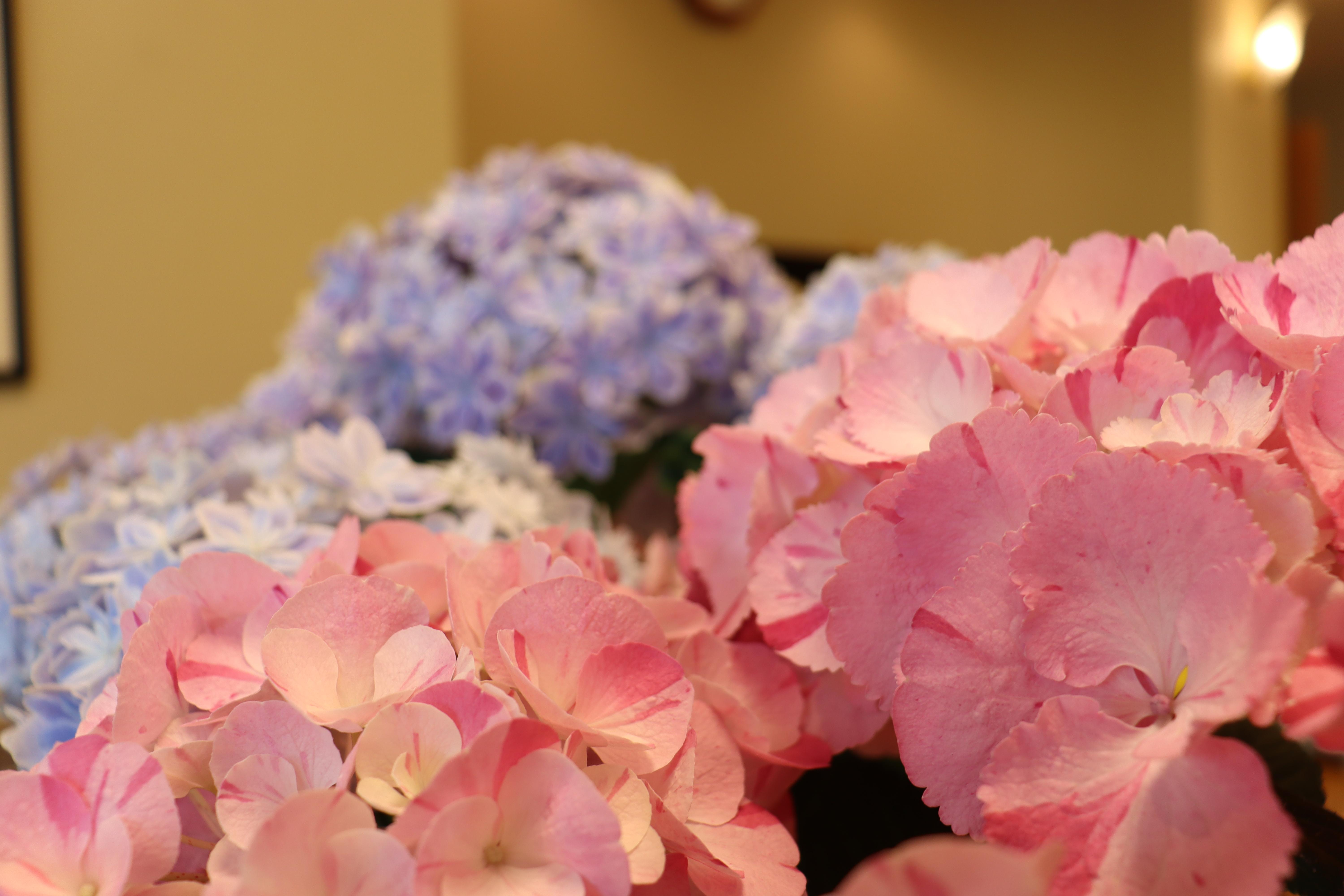 ロビーに置いてあるリハビリ器具「スカイウェル」の横に、紫陽花を飾りました!