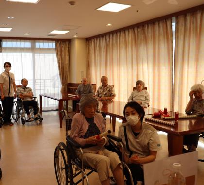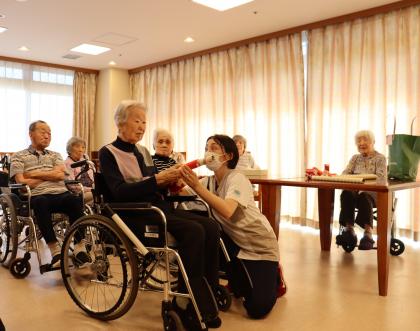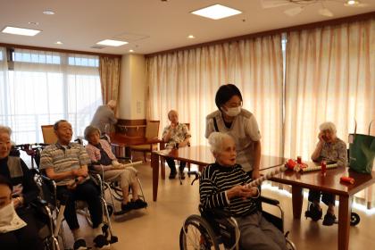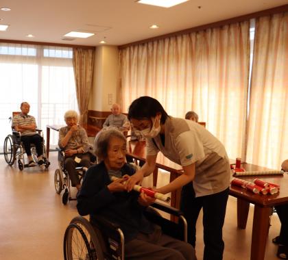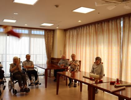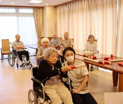こちらの射的は、機能訓練指導員お手製のラップの筒を利用した物で、弾を飛ばして的に当てると言ったお手軽で安全な、どなたでも楽しめるゲームとなっております。