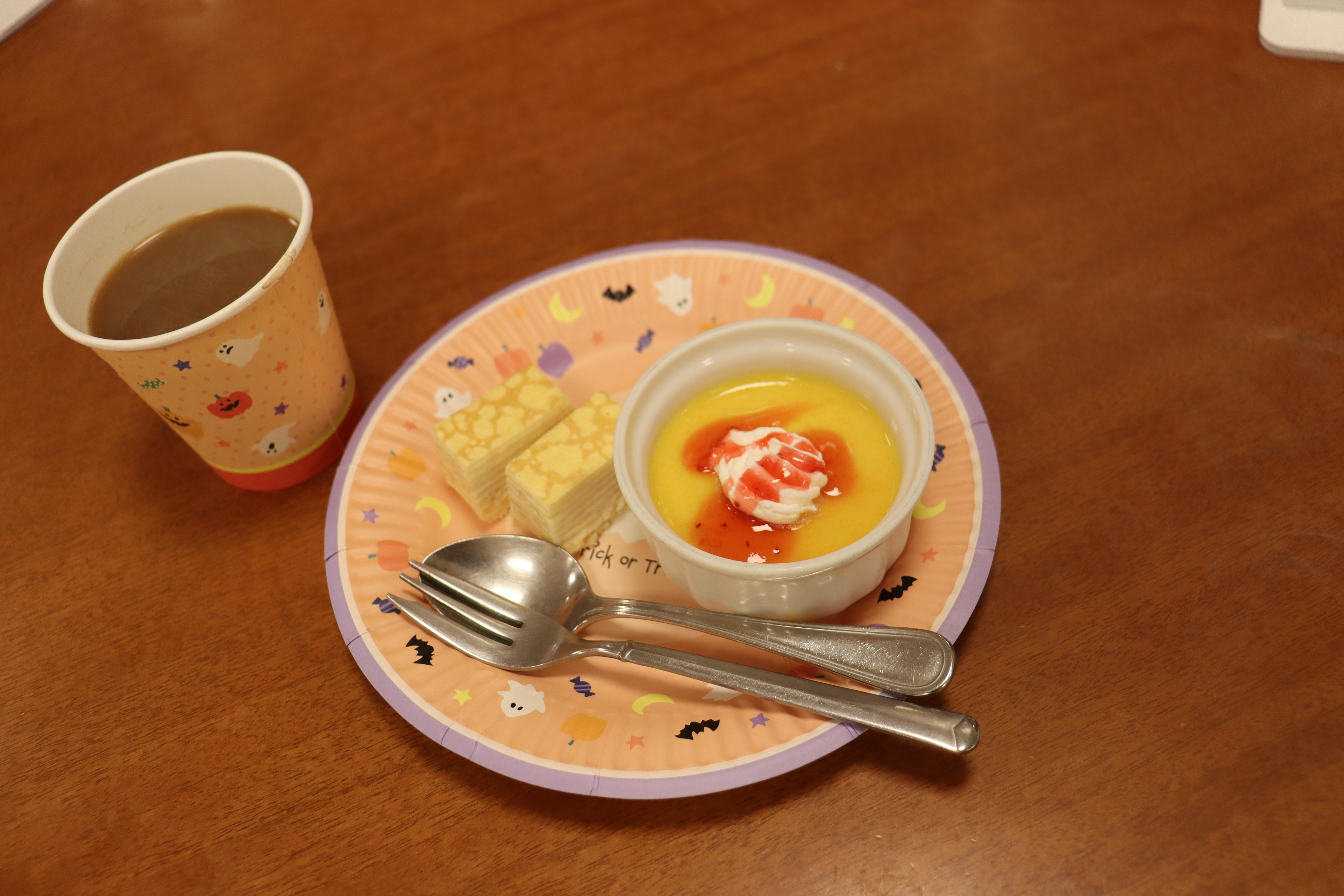 本日のおやつは、≪かぼちゃのババロアとカットケーキ≫です。ハロウィーン柄のお皿とカップにて、提供させていただきました。