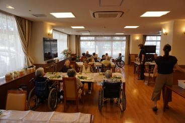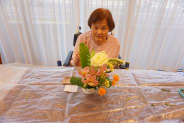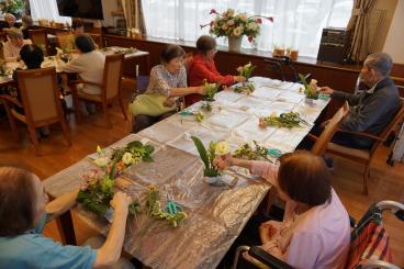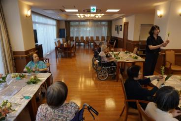 いつも館内を、季節の花々で華やかに飾ってくださっている矢吹先生の、フラワーアレンジメント教室が今月も開催されました。