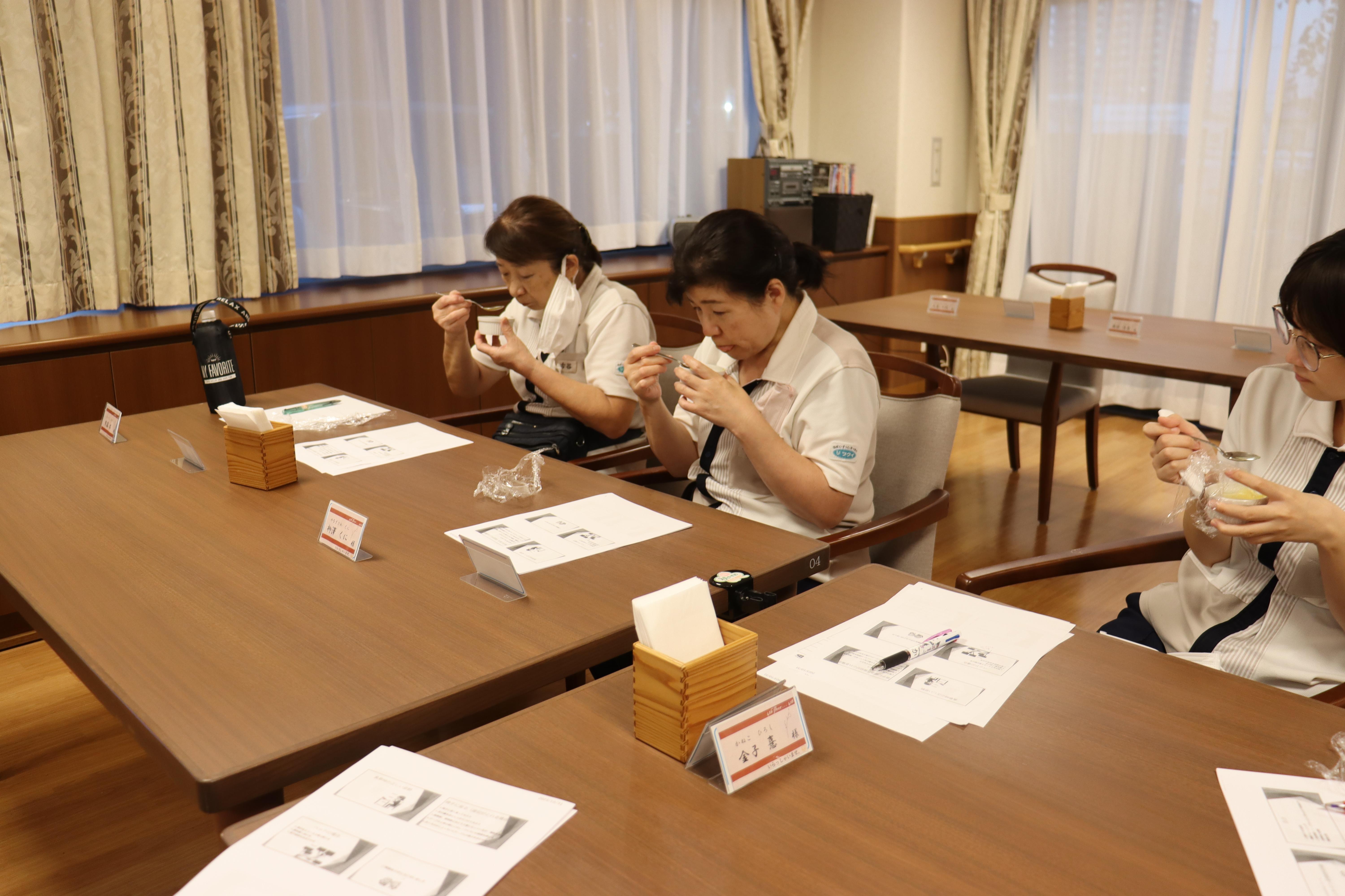 厨房の協力で嚥下食の試食を行いました。食材の形がなくなることで何を召し上がっているのか分かるよう食事前のメニュー紹介の大切さを再認識しました。いつまでも楽しく、美味しい食事提供を心掛けていきたいと思います。