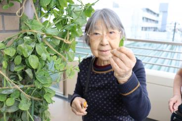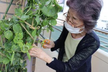 4階のベランダにて育てているさやえんどうが、収穫の時期を迎えました。