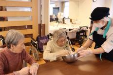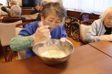 白玉粉と小麦粉、水、そして砂糖、順番によく混ぜ合わせ、食紅で桜色に。白い生地がパァッと桜色になると、お客様から「アラ~」「きれいねえ」と、お声が聞こえました。ホットプレートでその生地を焼いていると、食堂内にはいい匂いが広がります・・・焼きあがった皮に、丸めたこしあんをつつみ、最後に桜の葉の塩漬けでつつむとできあがり!