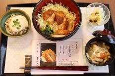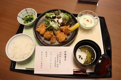 鳥取県の地鶏、大山鶏(ダイセンドリ)を香ばしいから揚げに。野沢菜の歯ごたえ、花ガツオと昆布でだしを取ったあおさのりの吸い物、さっぱりとした変わり種ヨーグルト。食べ応えのある定食ですが、皆様ほとんど完食。