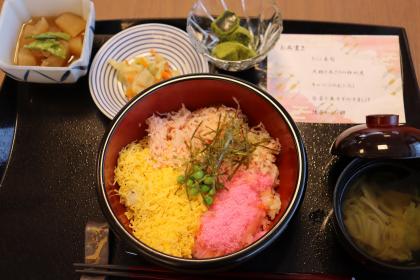 混ぜ込みちらしのご飯の上には、錦糸卵、カニほぐし、桜でんぷ。グリーンピースの緑が映えて、春の訪れを感じるちらし寿司です。