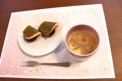 今日は桜茶と一緒に、一足早いお花見を食堂で楽しみました。
