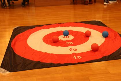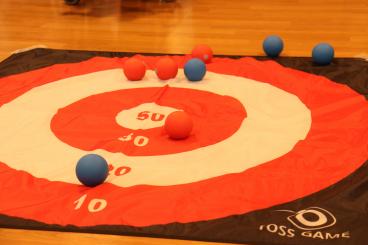 2チームが交互に床に敷いた的にボールを投げて、落ちた所の点数の合計で競います。