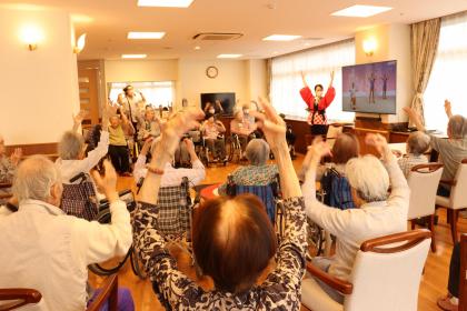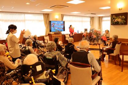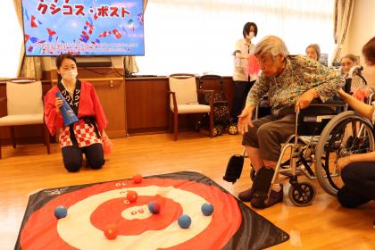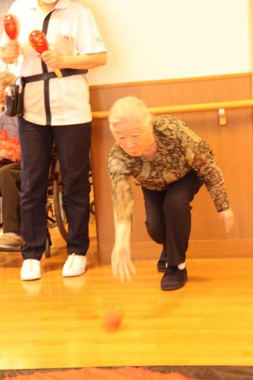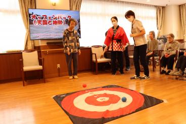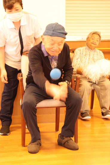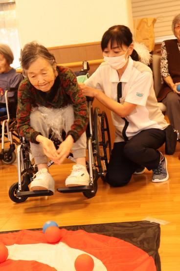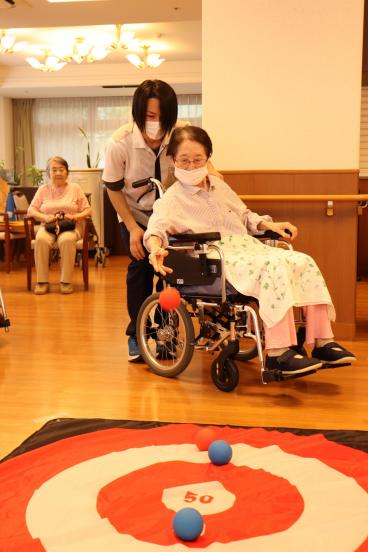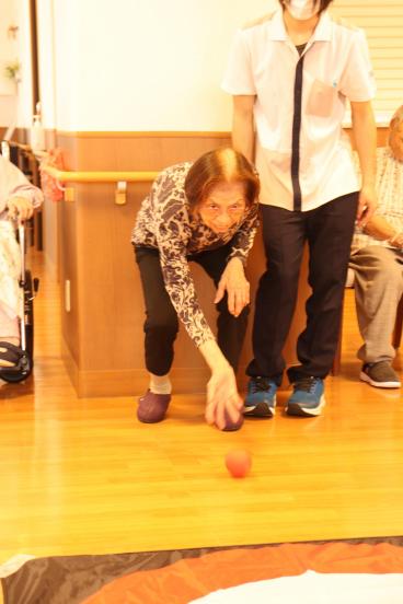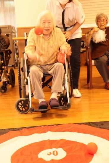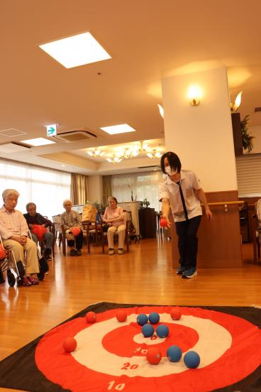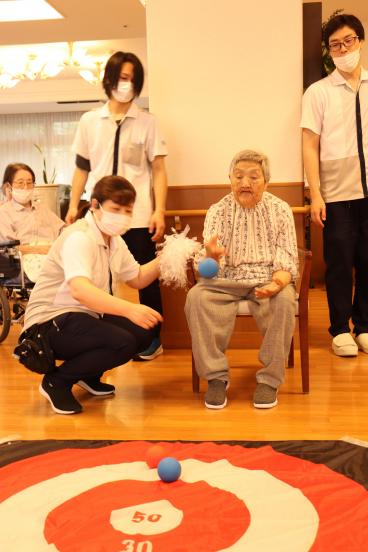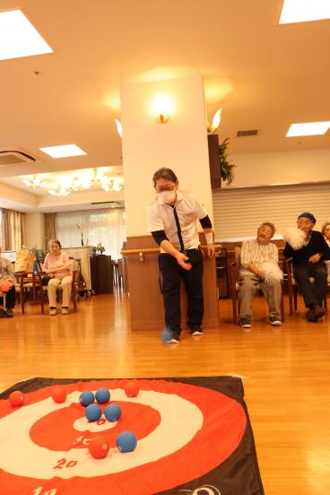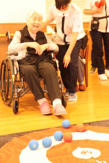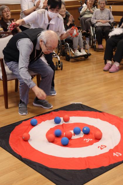 今月の誕生日会は、1階食堂でフロア対抗ボッチャ大会を開催しました。