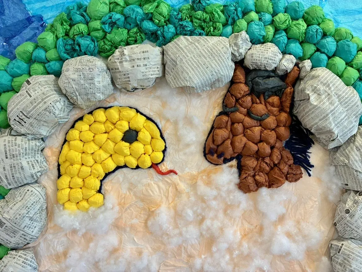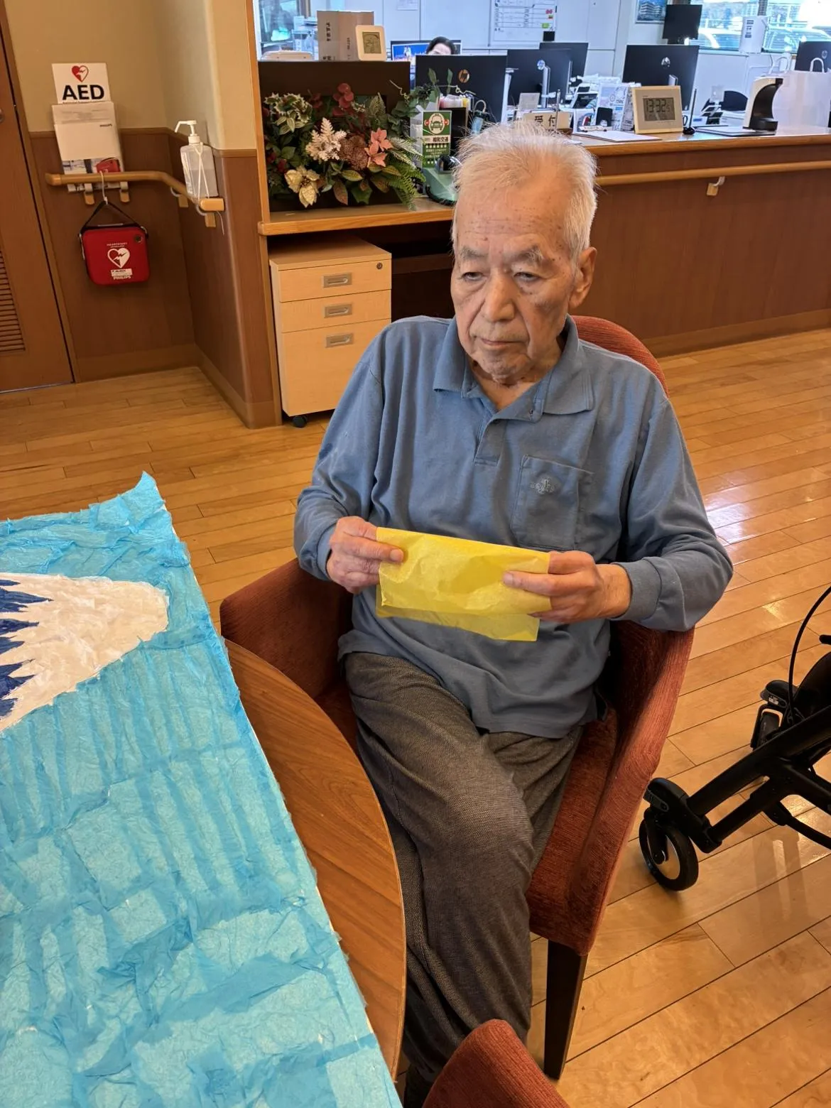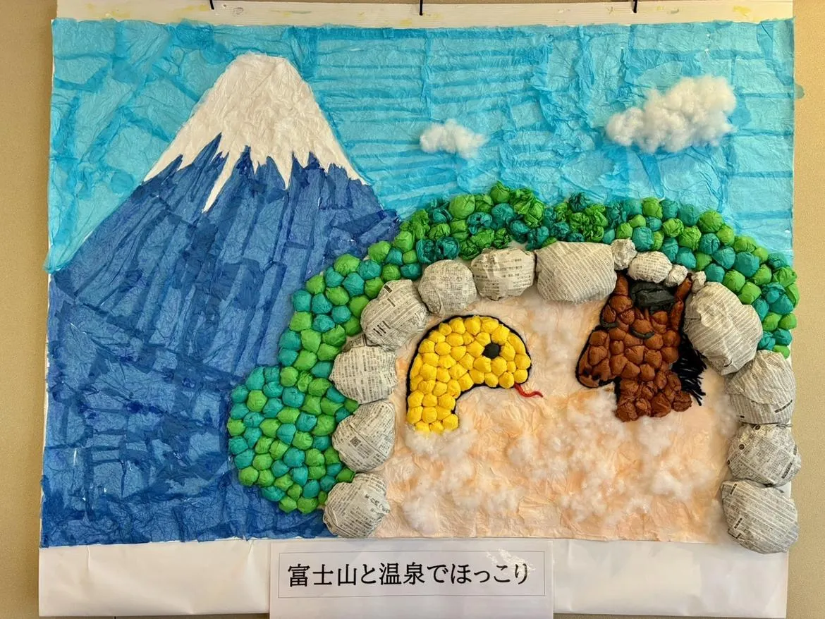 制作にはお花紙や毛糸を使い、お客様とスタッフが協力して一つひとつ丁寧に仕上げました。作業中は「富士山がきれいにできたね」「温泉に入りたくなるね」と、笑顔があふれる時間となりました。