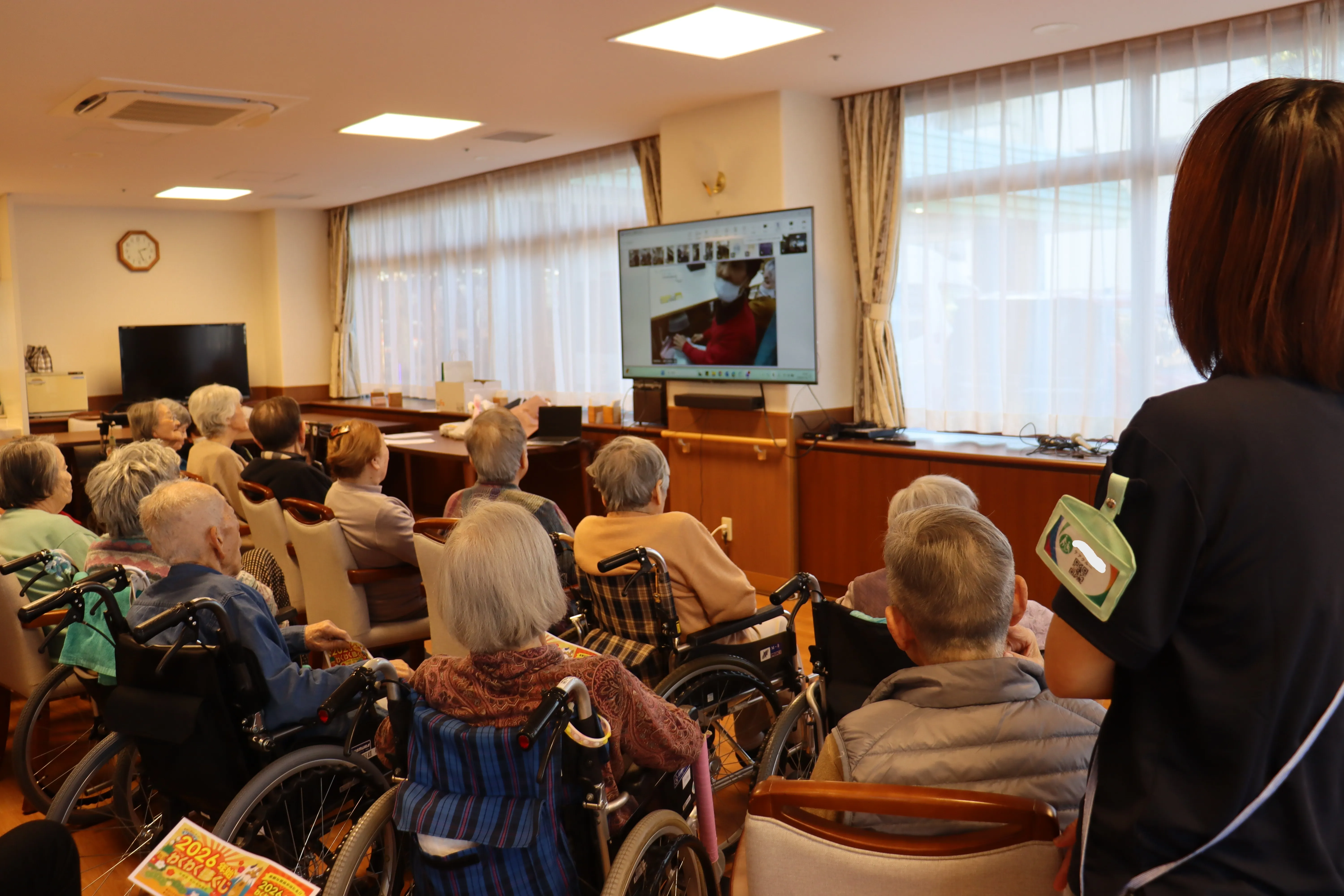 各事業所が画面越しにつながり、いつもとは違う雰囲気に。
